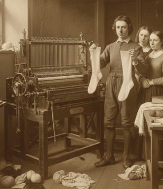 So at age 19 he designed and built a specialized knitting machine capable of producing seamless stockings and tights. His innovation was a machine that could knit tubular, seamless forms directly—essentially creating a continuous, tube-shaped stocking without the need for seaming.